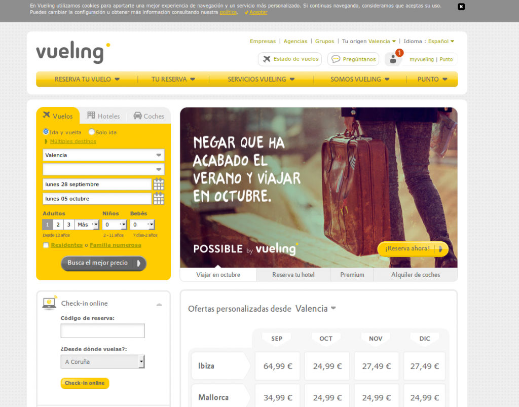 Vueling es un buen ejemplo de creación de marca, un factor que es decisivo en una estrategia adecuada de marketing de cualquier tipo, y que también se debe aplicar en marketing de contenidos. Vueling siempre emplea el “tú” para referirse a sus clientes o potenciales, y el amarillo destaca por todas partes en sus anuncios y servicios. Es una marca que ha sabido diferenciarse como compañía de vuelos low-cost y su aire juvenil y spanglish la ha hecho única entre sus competidores.