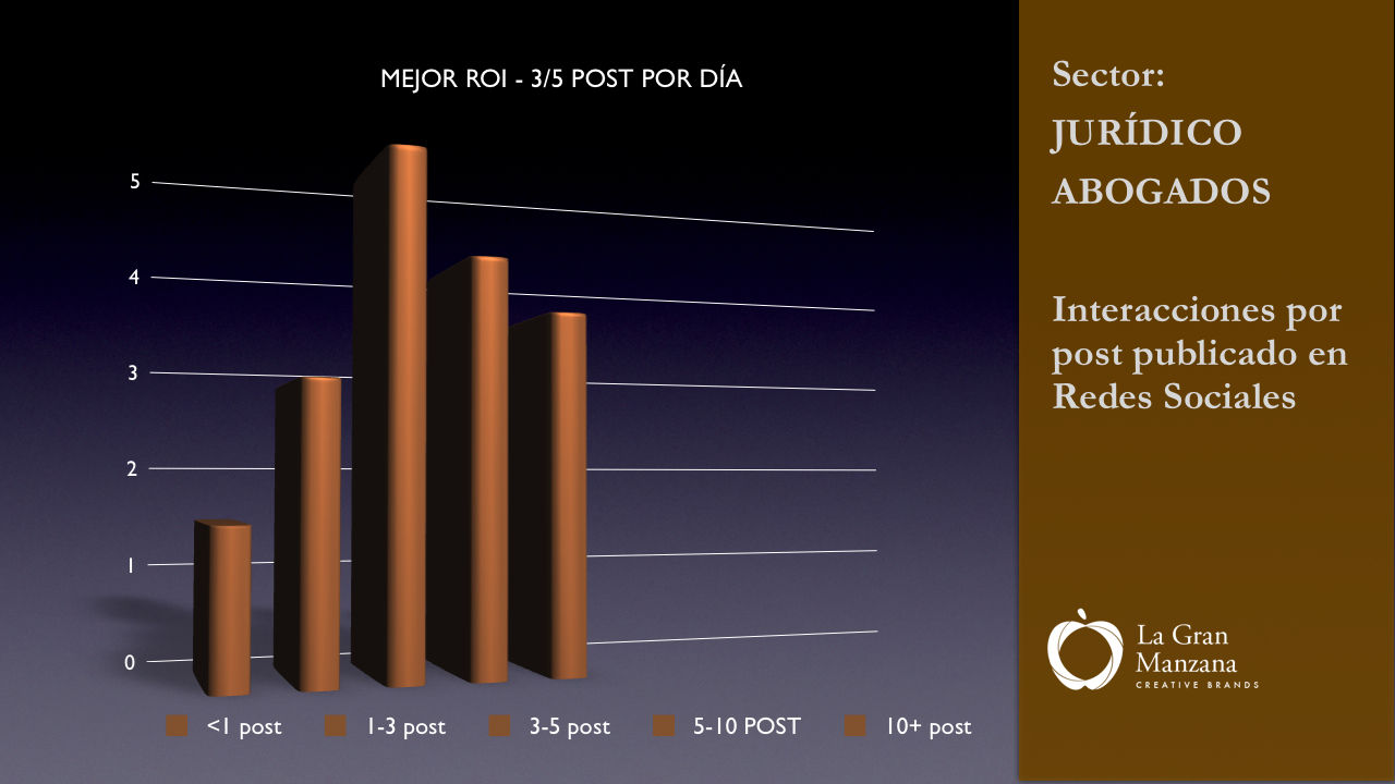 El mejor resultado se encuentra con los Despachos de Abogados que publican entre 3-5 post por día en los medios sociales. Esto es debido con toda probabilidad a que los Abogados son vistos como líderes de opinión y expertos profesionales entre los seguidores y audiencias en general, y probablemente tienen algunos clientes fieles y leales que valoran su contenido y lo comparten tan pronto como sea posible.
