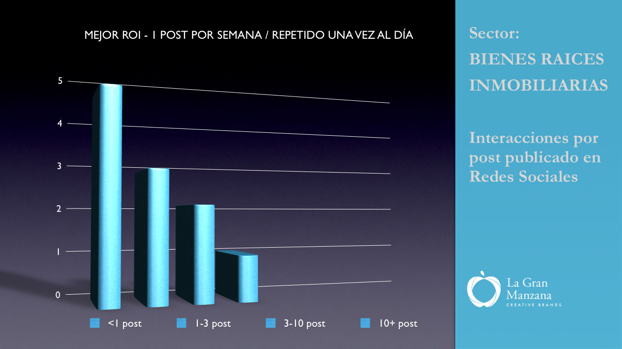 Si estás en el sector inmobiliario, considera publicar un post a la semana en tu canal de mejor rendimiento. Procura no abusar de ofertas de viviendas y ofrece información de valor a tus clientes. En este post sobre Agencias Inmobiliarias y Social Media Marketing encontrarás algunas respuestas. Ahora ya sabes que un post por semana recibe la mayor cantidad de interacciones, puedes aprovechar esto en tu próxima estrategia.
