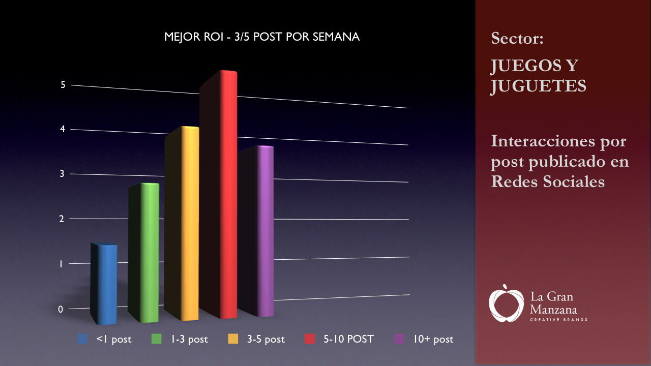 Al igual que el sector inmobiliario, las empresas jugueteras que publican un post por semana en los medios sociales, ven un mejor retorno de la inversión cuando publican 1 post por semana pero lo comparten una vez al día. Sin embargo, al mismo tiempo, vemos un crecimiento en las interacciones con las empresas del sector juguete que están publicando 3-5 veces por día y aún observamos un aumento mayor en la participación cuando las compañías publican 5-10 veces. Sin embargo a partir de 10 publicaciones la interacción baja.