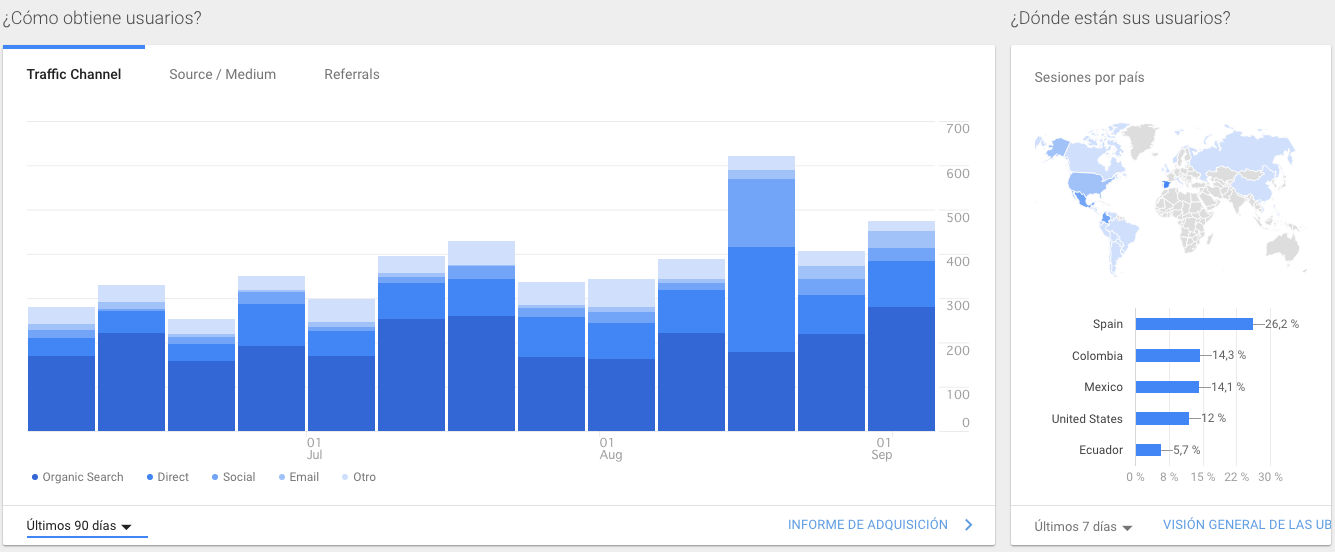 He aquí un ejemplo de los cuadros de Google Analytics (GA) que forman las bases de la mayoría de las plataformas de análisis web: