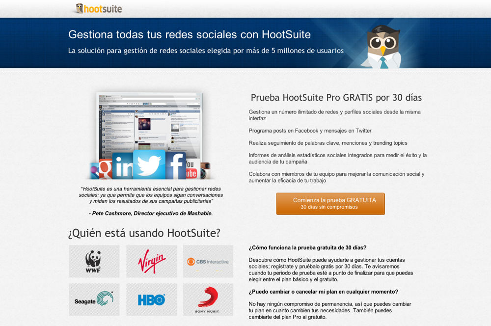 Hootsuite es una herramienta muy útil que permite gestionar una o varias cuentas en las principales redes sociales: Twitter, Facebook, Google+, LinkedIn, … De esta forma, desde un único punto de acceso podemos visualizar y publicar en diferentes cuentas al mismo tiempo.