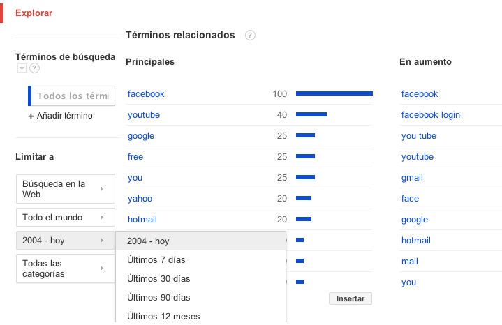 La variable tiempo es muy importante en el estudio de cualquier Plan de Negocio. No siempre nos va a interesar ver la evolución de un término desde 2004 hasta hoy, que es el parámetro por defecto que nos ofrece Trends. A través de este filtro obtendremos información de las tendencias por año, o en la última semana. Es más, podemos establecer un intervalo de fecha a nuestra medida.