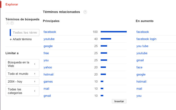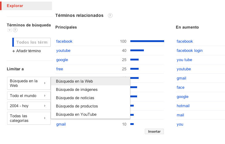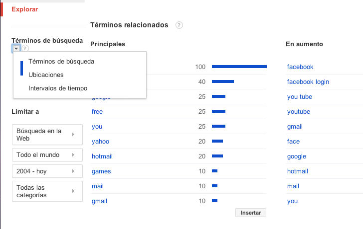 Con el objeto de seguir un proceso más sencillo, recomendamos centrarnos inicialmente en los Términos de Búsqueda, pues como veremos a continuación, Trends nos ofrece la posibilidad de limitar (filtrar) las búsquedas principales en diferentes factores:
