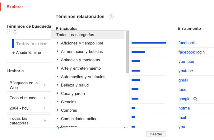Por último, Google Trends nos ofrece la posibilidad de limitar la búsqueda a las diferentes Categorías en las que divide sus datos. No es muy aconsejable. Los criterios de Google es posible que no coincidan con los resultados que deseamos obtener, por lo que, en este caso, deberíamos prescindir de este filtro.